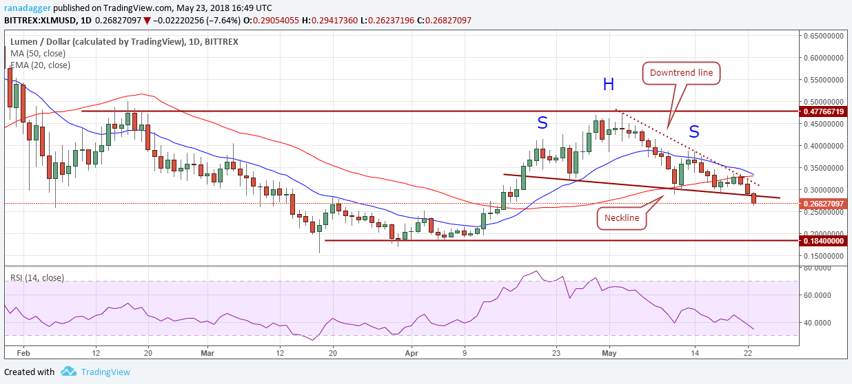 Stellar has broken below the neckline of the head and shoulders pattern, which is a bearish sign. Though the pattern targets are much lower, it should now decline to the strong support level of $0.184. This level had held for about a month from mid-March to mid-April of this year, hence, we can again expect some buying to emerge at $0.184.
