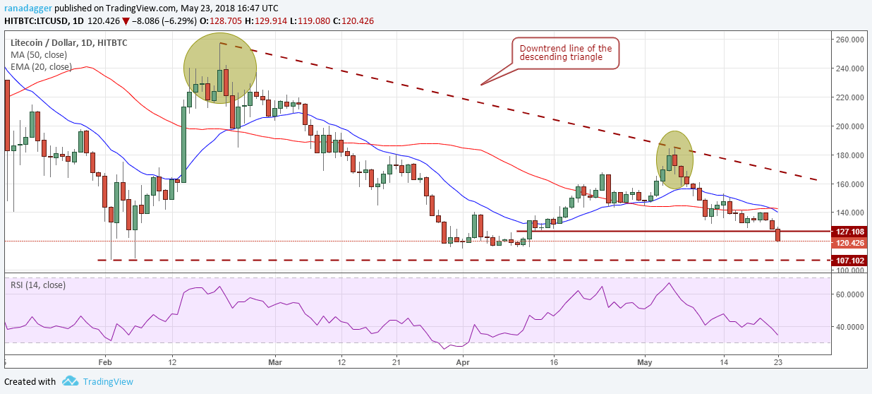 We anticipate strong support in the zone between $107-$115 because if the low of $107 breaks, it will complete a bearish descending triangle pattern that will be very negative for the LTC/USD pair.