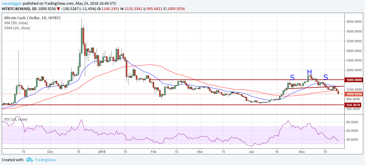 Bitcoin Cash broke below the neckline of the head and shoulders pattern on May 16, and the retest of the breakdown levels held on May 20 and May 21.