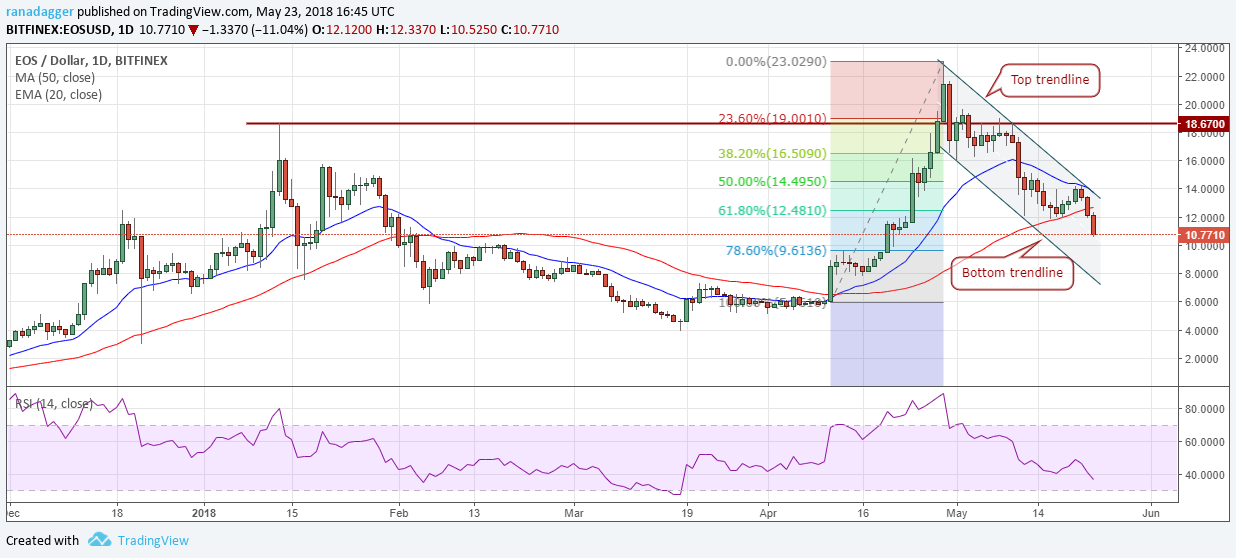 If both these levels break, the EOS/USD pair can decline to the bottom trendline of the channel at $8.