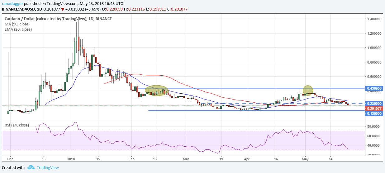Cardano has broken below the $0.23 levels, which had been acting as strong support for the past few days. It can now sink to the lows of $0.13 with minor support at $0.19.