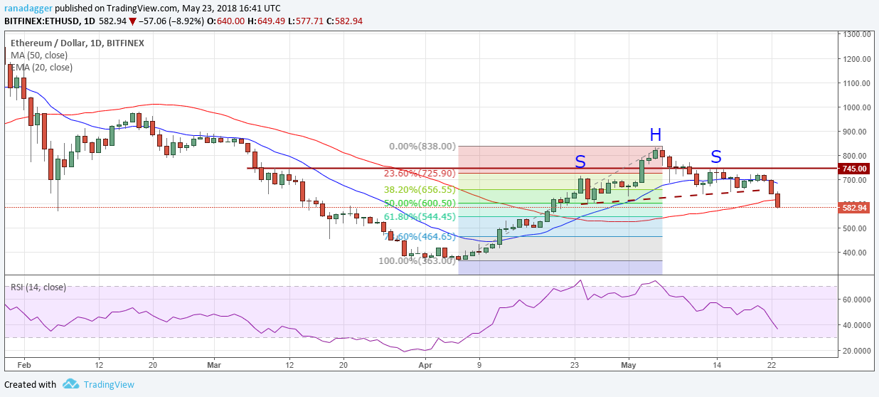 Ethereum broke below the neckline of the head and shoulders pattern on May 22. Today, it has extended the decline, breaking below the 50-day SMA and the 50 percent Fibonacci retracement of the latest rally. There is minor support at $544.45, at the 61.8 percent Fibonacci retracement levels, below which a plunge to $418 is likely.