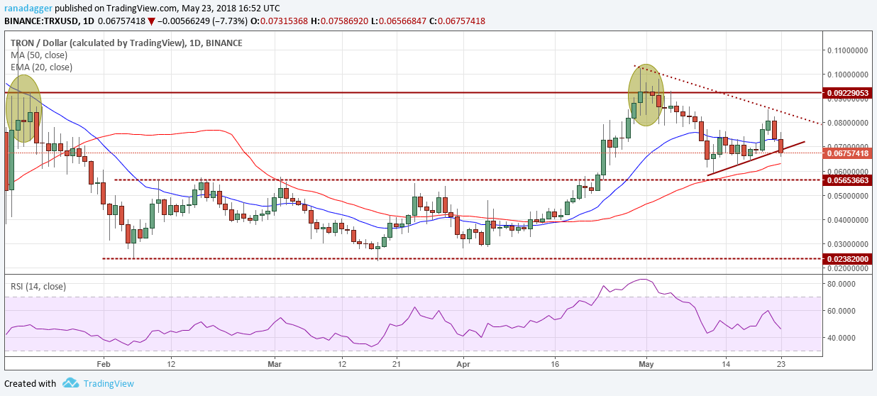 The TRX/USD pair has not broken below the $0.059 levels since April 25. Hence, a fall to $0.06 levels should attract buying.
