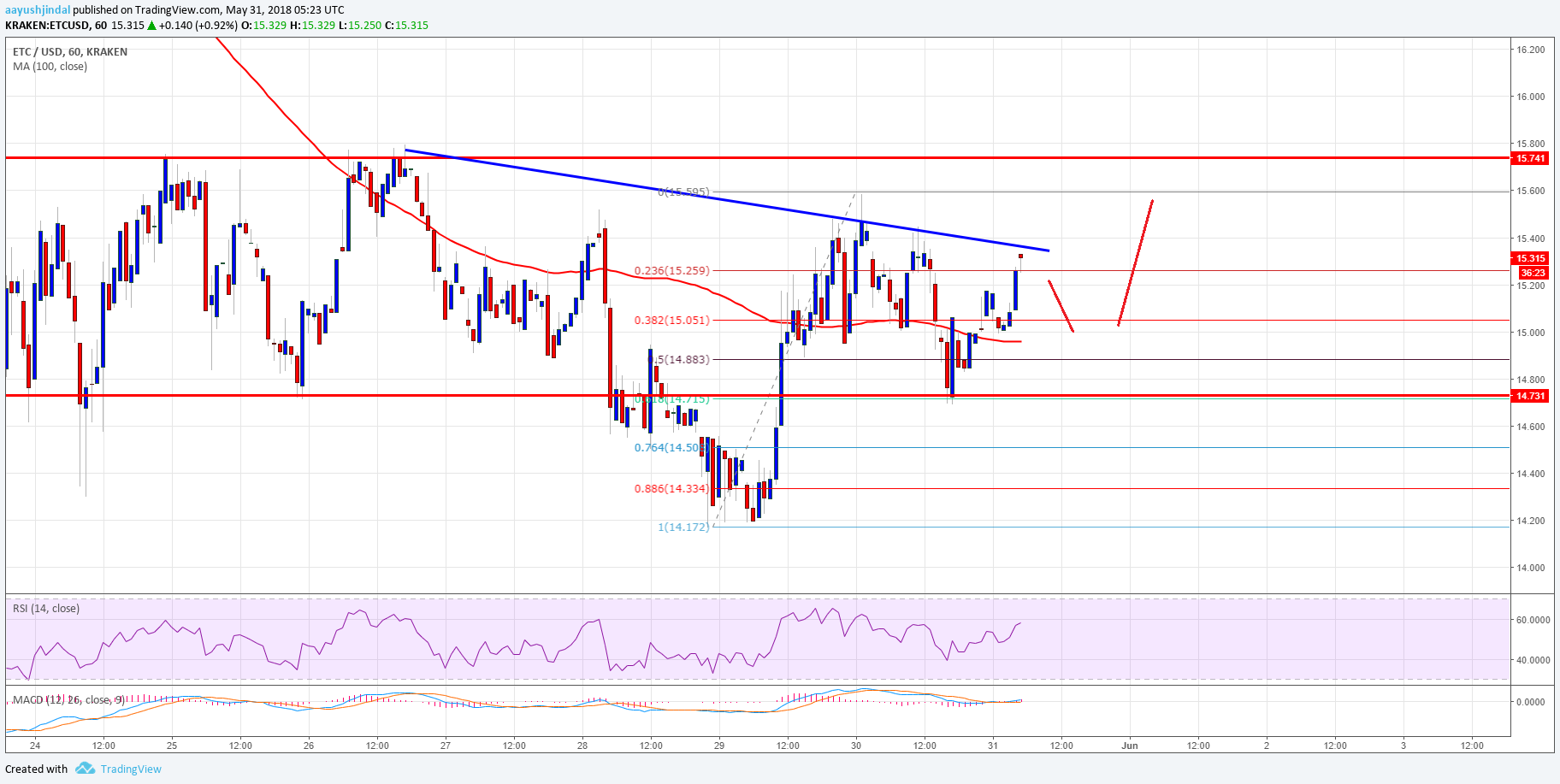 The past few sessions were mostly choppy since ETC price failed to move past the $15.40-50 resistance area against the US dollar. The ETC/USD pair recently tested the $15.60 level, but it failed to hold gains and moved down. It declined and traded below the 38.2% Fib retracement level of the last wave from the $14.17 low to $15.59 high.