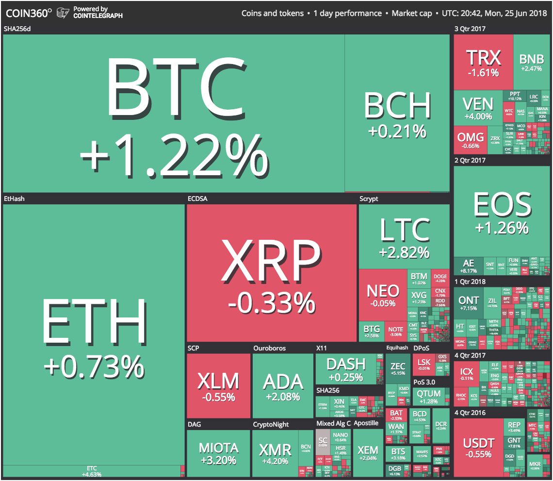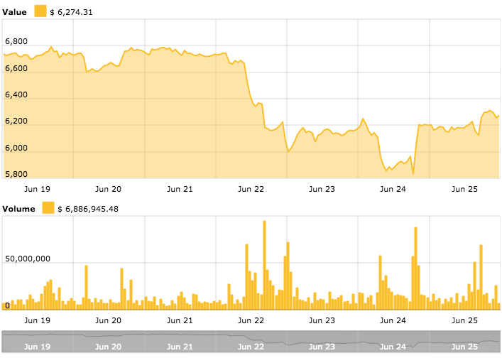 Bitcoin (BTC) is trading around $6,270 at press time, up about 1.3 percent over the 24-hour period. Yesterday, June 24, BTC plummeted to $5,833, its lowest price level in 2018, and a price point it had not hit since October 2017. A rapid three-hour bounce yesterday between 2 and 5 PM UTC saw the coin recover back to around $6,200, today reclaiming a further $100.