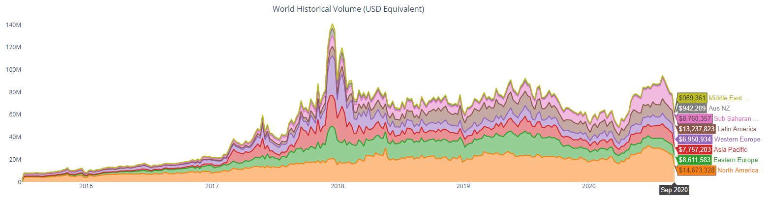 Sub-Saharan African has been the second-largest region for P2P trade after North America for much of 2020. It saw P2P volume fall 32%, from roughly $12.9 million to $8.7 million — driven by a 38% crash in Nigerian activity.