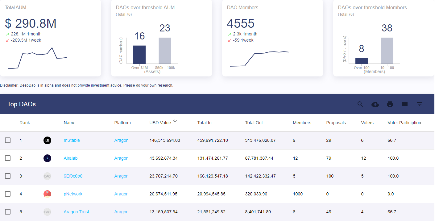The revamped website provides key overviews of the DAO sector, including weekly and monthly fluctuations in assets under management (AUM), a tally of the total membership of DAOs combined, and a running score of the DAOs that represent more than $1 million in AUM or more than 100 members.
