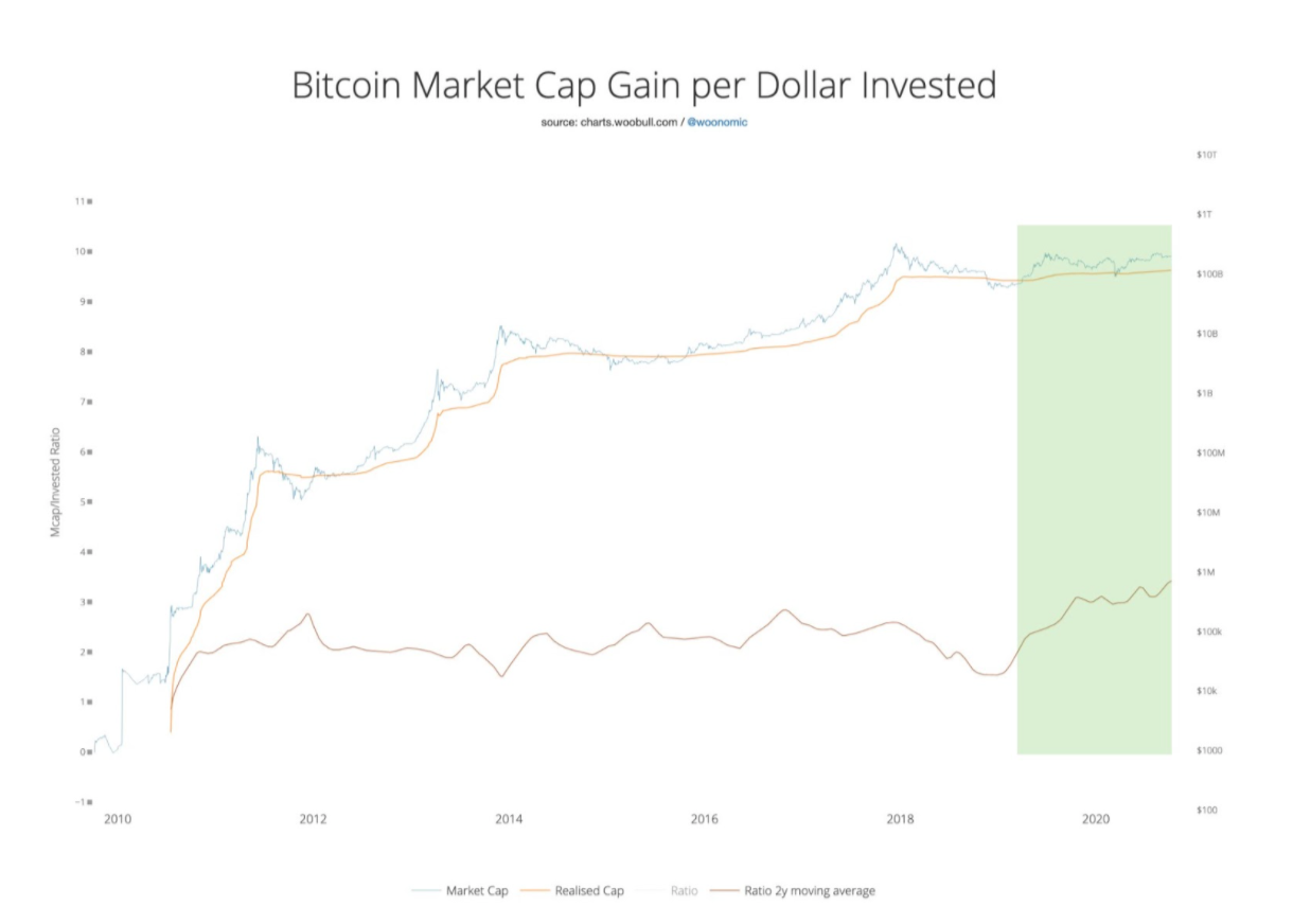 Bitcoin market cap gain per dollar invested or reflexivity. Source: Willy Woo