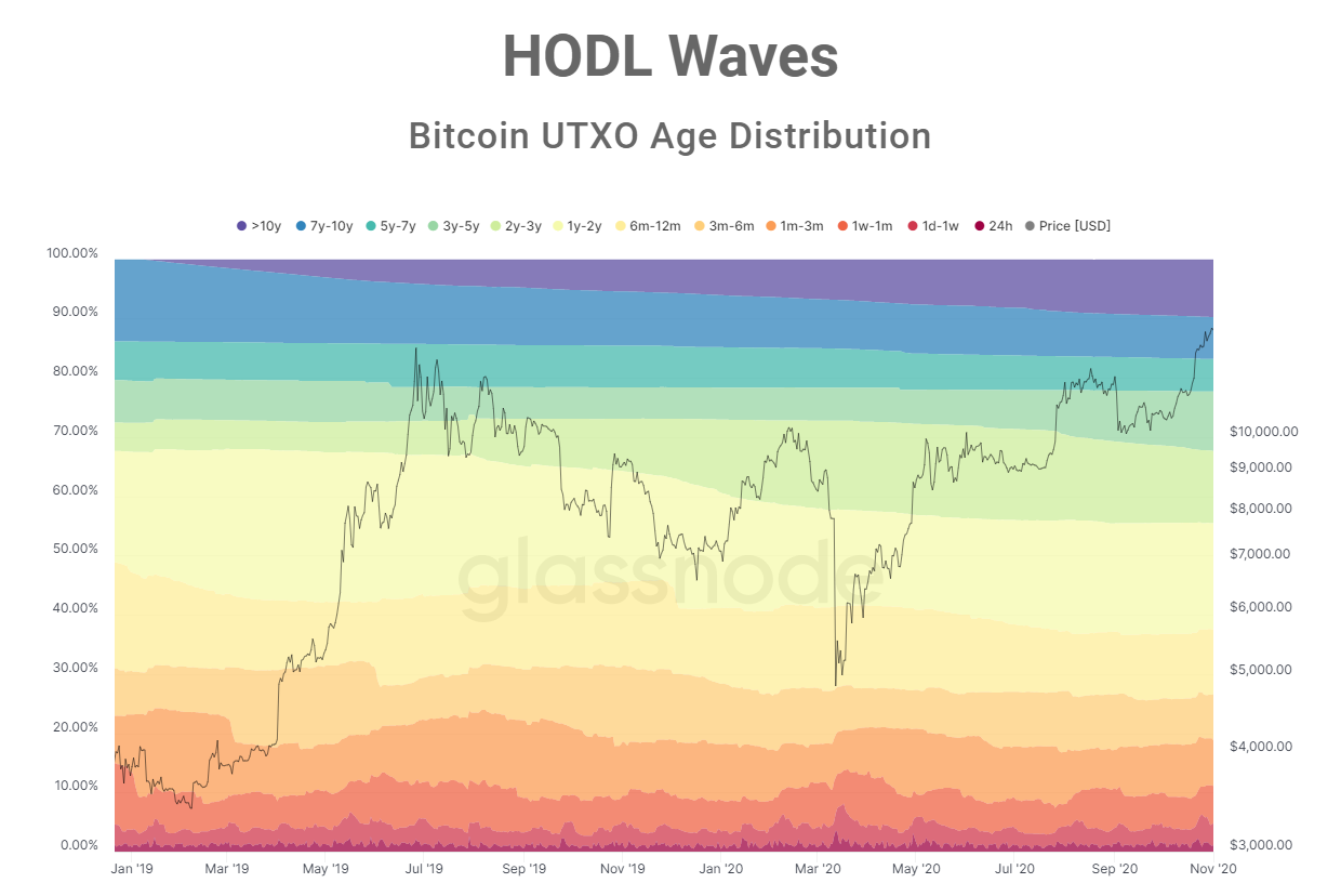 Based on HODL waves, which evaluate the trend of long-time Bitcoin holders, more investors are increasingly holding BTC for longer periods.