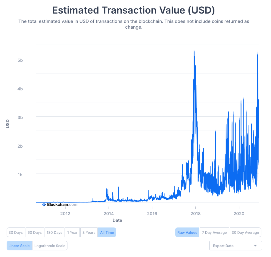 Blockchain.com data shows that as of Dec. 1, the total estimated value of transactions on the Bitcoin blockchain was estimated at $4.627 billion. This figure hit $5.15 billion, close to its all-time-high, on Nov. 5.
