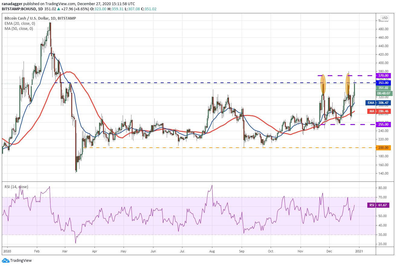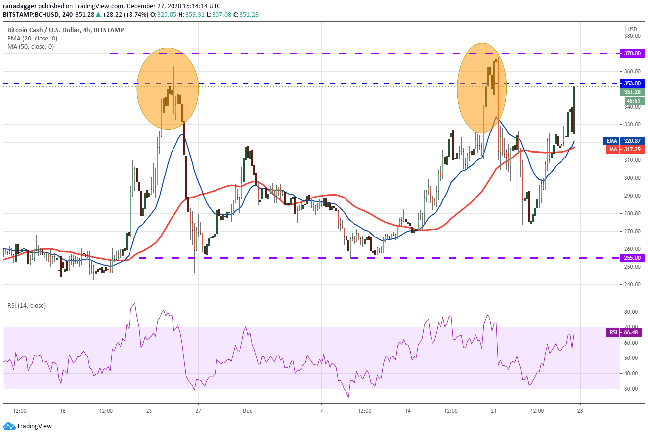 Bitcoin Cash (BCH) has been repeatedly attempting to break above the $353 overhead resistance for the past few days. Although the bulls had pushed the price above $353 on two occasions, marked via ellipse on the chart, they could not sustain the higher levels.