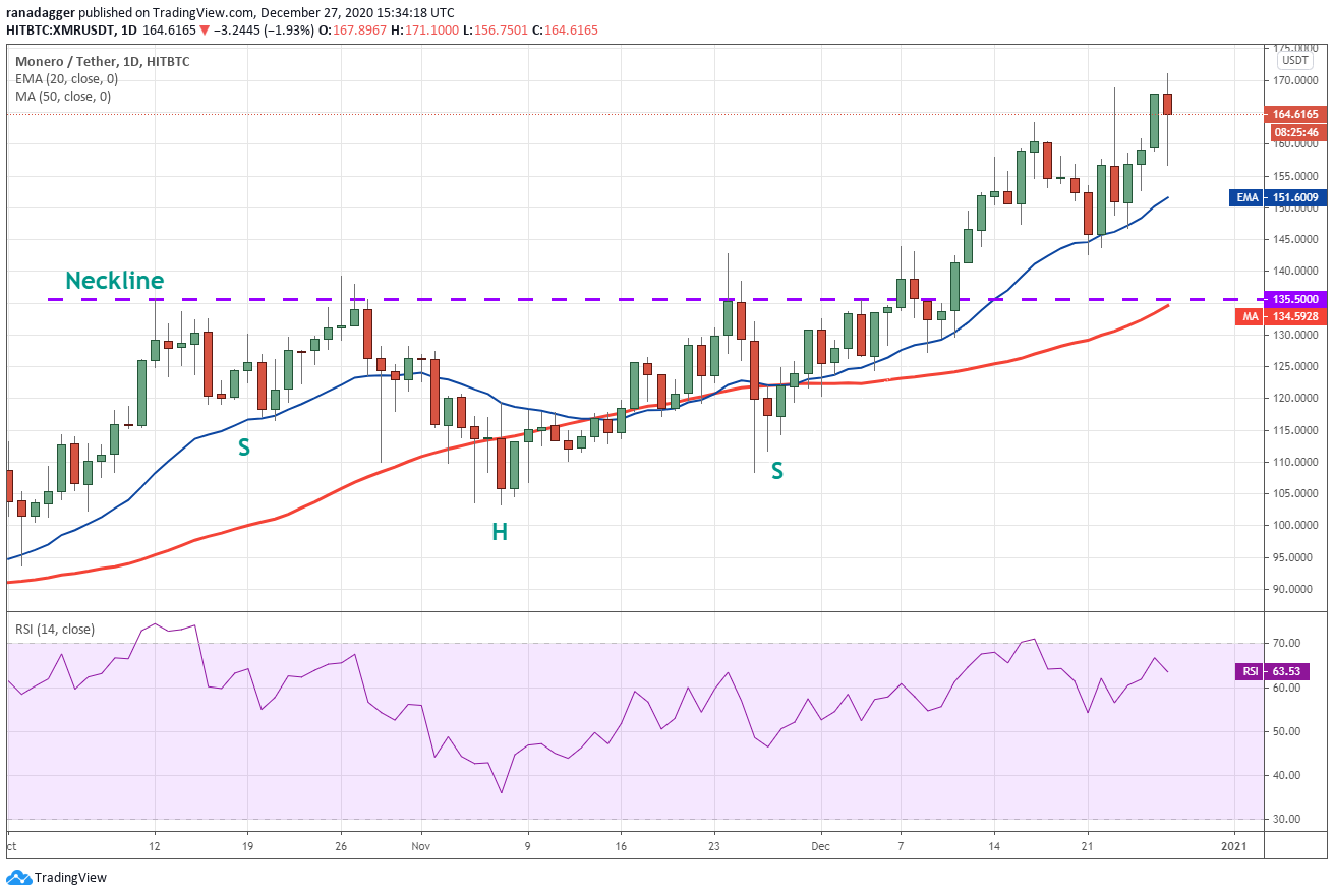 The long wick on Dec. 23 candlestick shows traders booked profits after Monero (XMR) hit $167, the target objective of the breakout from the inverse head and shoulders pattern.