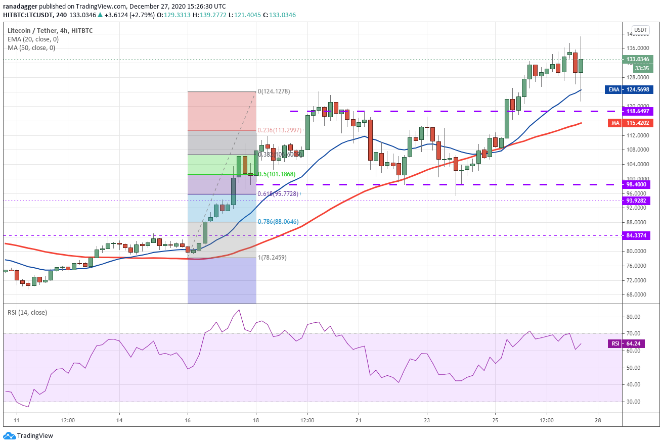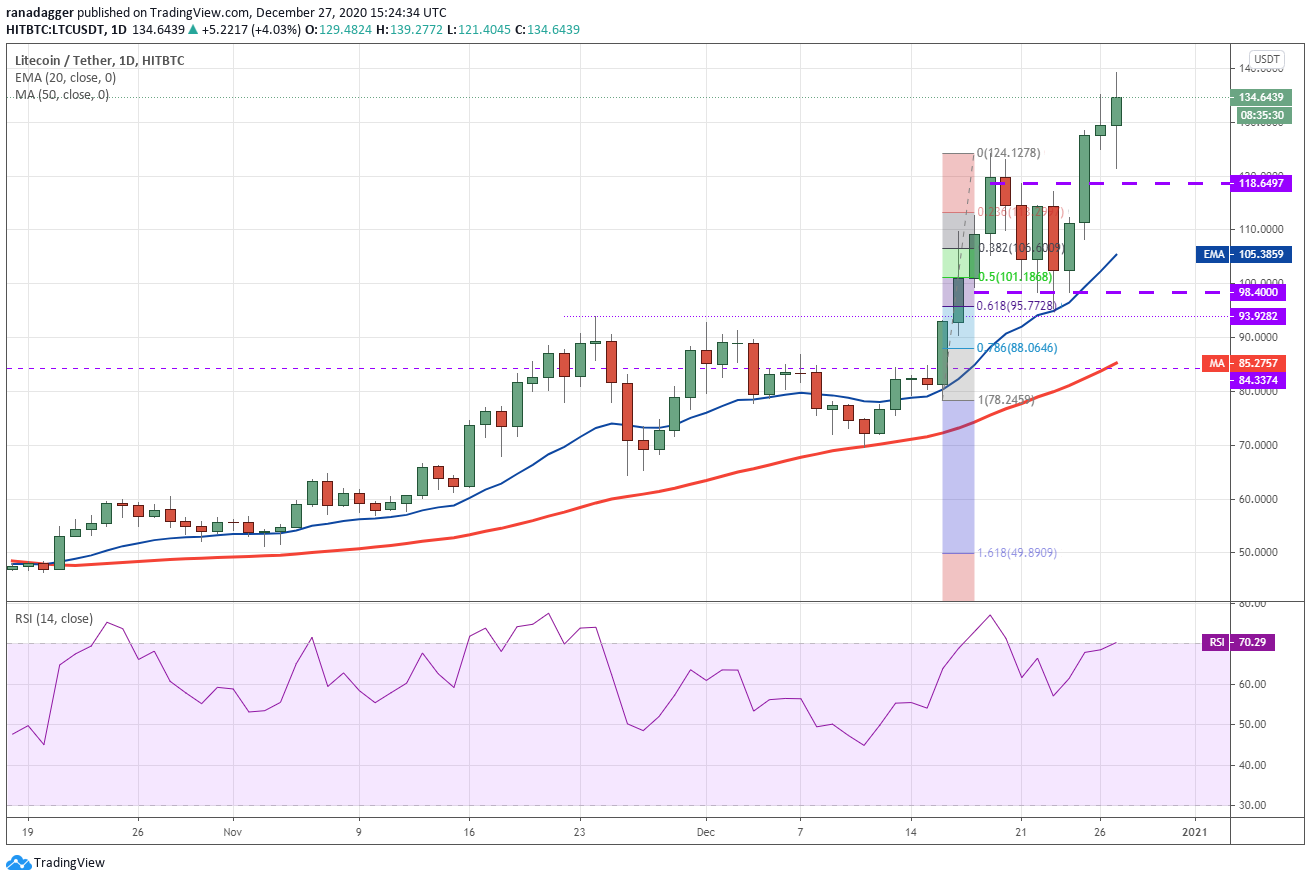 In a strong uptrend, traders usually buy the dips to the 20-day EMA ($105) and that is what happened on Dec. 23. Litecoin (LTC) rebounded sharply on Dec. 24 and the momentum picked up after the bulls pushed the price above the $118.64 to $124.12 overhead resistance zone.