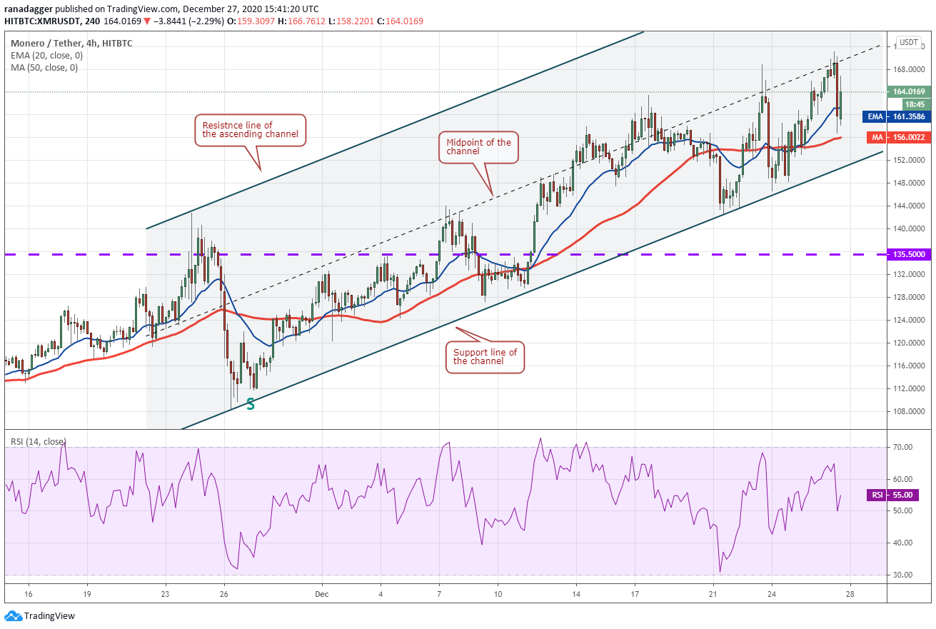 The long tail on today’s candlestick shows that bulls are buying on dips. If they can push and sustain the price above $170, the XMR/USD pair could rally to the next target objective at $197, just below the psychological resistance at $200.
