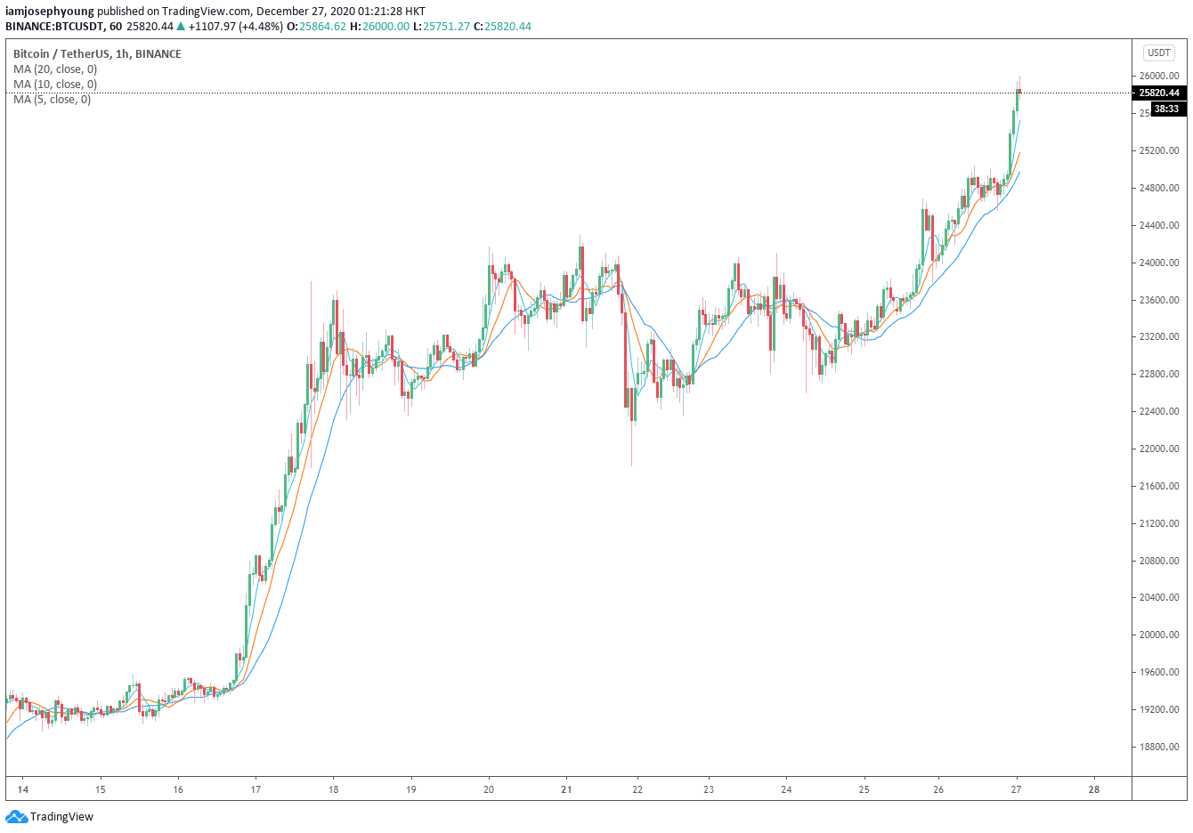 The price of Bitcoin (BTC) has reached a new all-time high of $25,945 on Binance on Dec. 26 just a day after it achieved its previous record high on Christmas day.