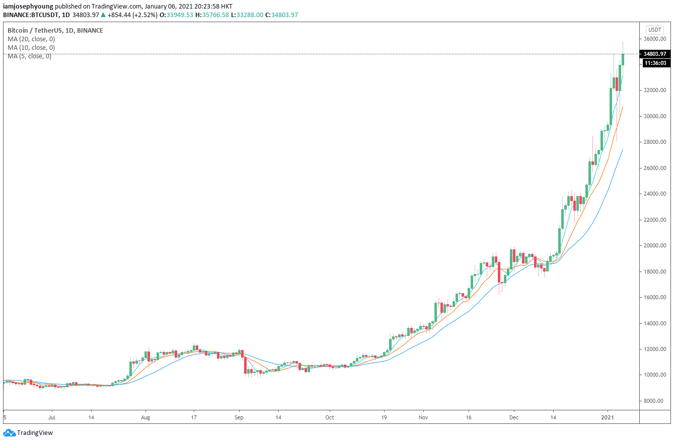 “Bitcoin is continuing to set new highs, breaking above $35,700 for the first time ever on Jan 5. $BTC is now up 74.9% since breaking the previous ATH on December 16. As the price continues to go up, the Hash Rate is also pushing towards new records.”