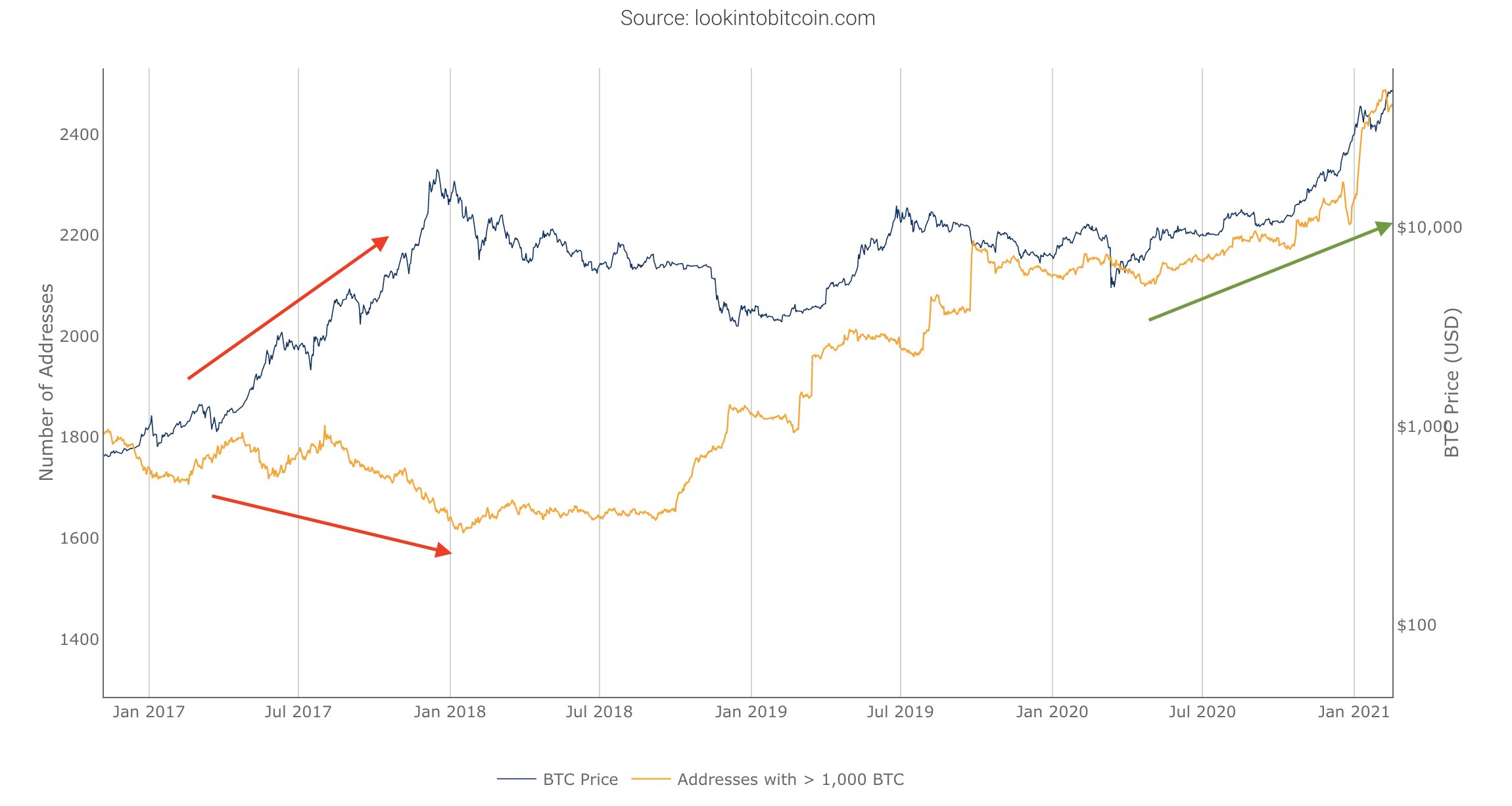 Bitcoin whale addresses vs. BTC/USD chart. Source: Dovey Wan/Twitter