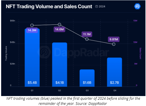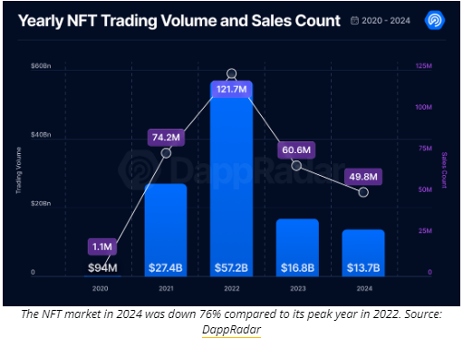 DappRadar found the NFT market last year was the worst since 2020 for trading and sales volumes, with both falling nearly 20% over 2024.