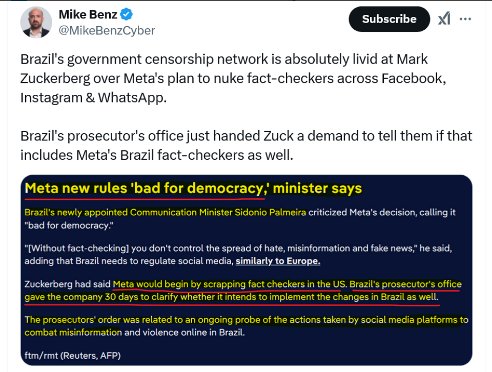 Brazil wasn’t pleased with Meta’s decision to rely on community notes, stating it would not subject its population to social media platforms that lead to “digital carnage or barbarity.”