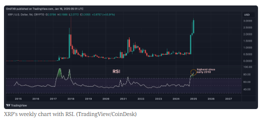 XRP is witnessing the fastest observed rally since the altcoin boom of January 2018, according to a popular market analysis tool called the relative strength index (RSI). The measure oscillates between 0 and 100, measuring the speed and change of price movement over specific periods, typically 14 days or 12 months.