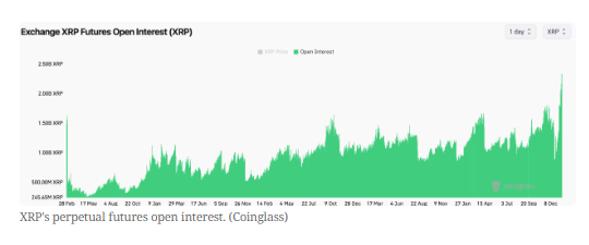 XRP's perpetual futures open interest has surged to a record high of 2.34 billion XRP, with funding rates representing the cost of holding leveraged bets hovering around 13%. That's well below the overheated 100% in early December, which signaled excess bullish leverage. In other words, the XRP market is much healthier and supports continued price gains.