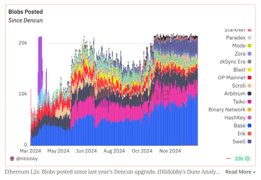 That's evident from the spike in the number of blobs or binary large objects posted by hundreds of L2s to Ethereum. Since November, the daily tally has averaged a record 21,000, according to pseudonymous data analyst Hildobby's Dune Analytics dashboard.