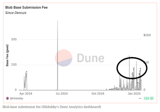 Since November, the demand for blobs has been so high that the target of three has consistently been met. In other words, scores of L2s are competing for the per-block target, driving base fees higher.