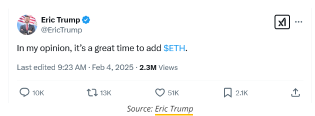 “In my opinion, it’s a great time to add $ETH. You can thank me later,” Trump wrote in a Feb. 3 X post. However, he has since edited the post to remove those last five words.