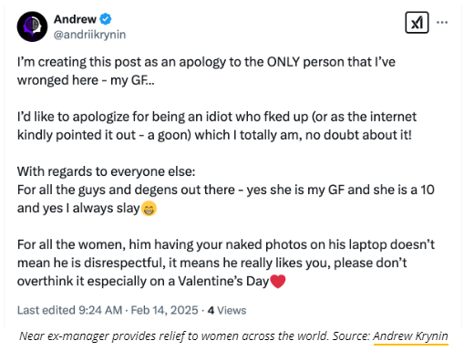 Ten hours later, Krynin posted an apology to “the ONLY person” he had wronged — his girlfriend. Still, he wrapped up the post by assuring “all the women” that if a man has naked photos on his laptop, it “doesn’t mean he is disrespectful, it means he really likes you.”