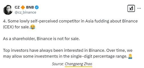 Binance co-founder and former CEO Changpeng Zhao denied rumors that the cryptocurrency exchange is up for sale.