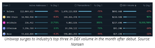 Uniswap had been the largest DEX for most of its existence, but high Ethereum gas fees drove users toward cheaper alternatives like Solana and BNB Chain — especially during the recent memecoin frenzy. Uniswap conceded the top DEX spot to Solana-based Raydium in October and November 2024 as a result.