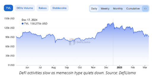 Industry-wide TVL has dropped from $138 billion in mid-December 2024 to $91.8 billion as of March 10, per DefiLlama.