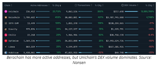 Berachain, which debuted in early February, reported a 30-day DEX volume of $3.78 billion, placing it eighth in the industry. It had a much higher number of active addresses than Unichain, which had 1.7 million.