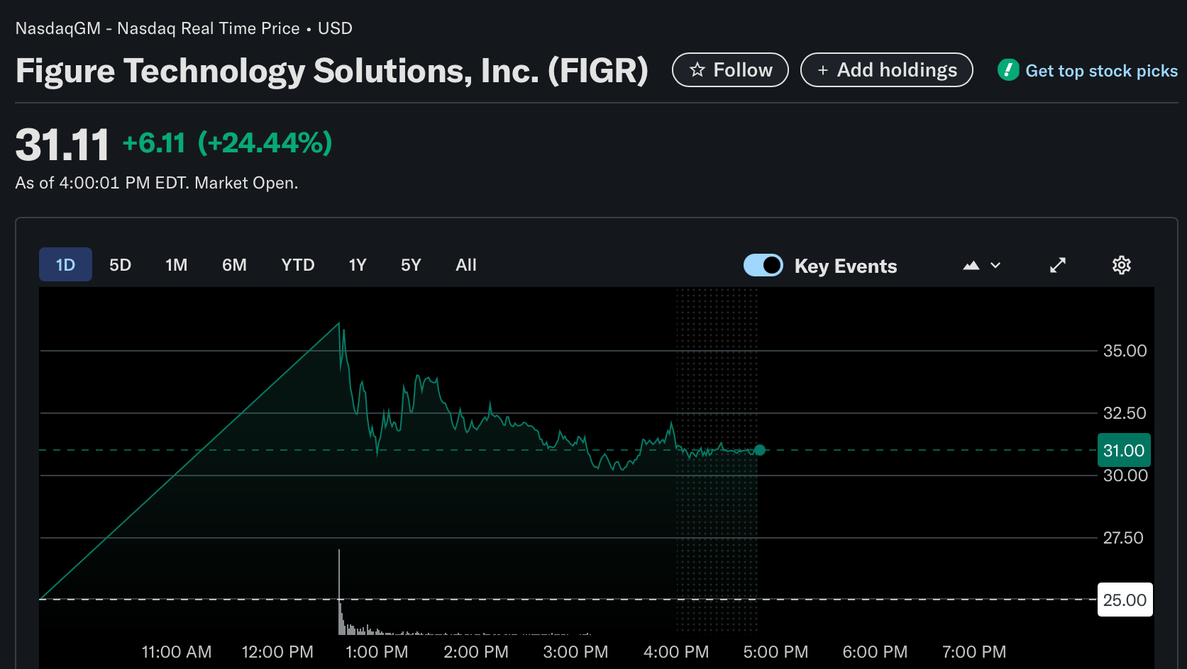 In another public listing, shares of Figure Technologies debuted on Nasdaq Thursday, with its shares jumping 24.4% in the first trading day.
