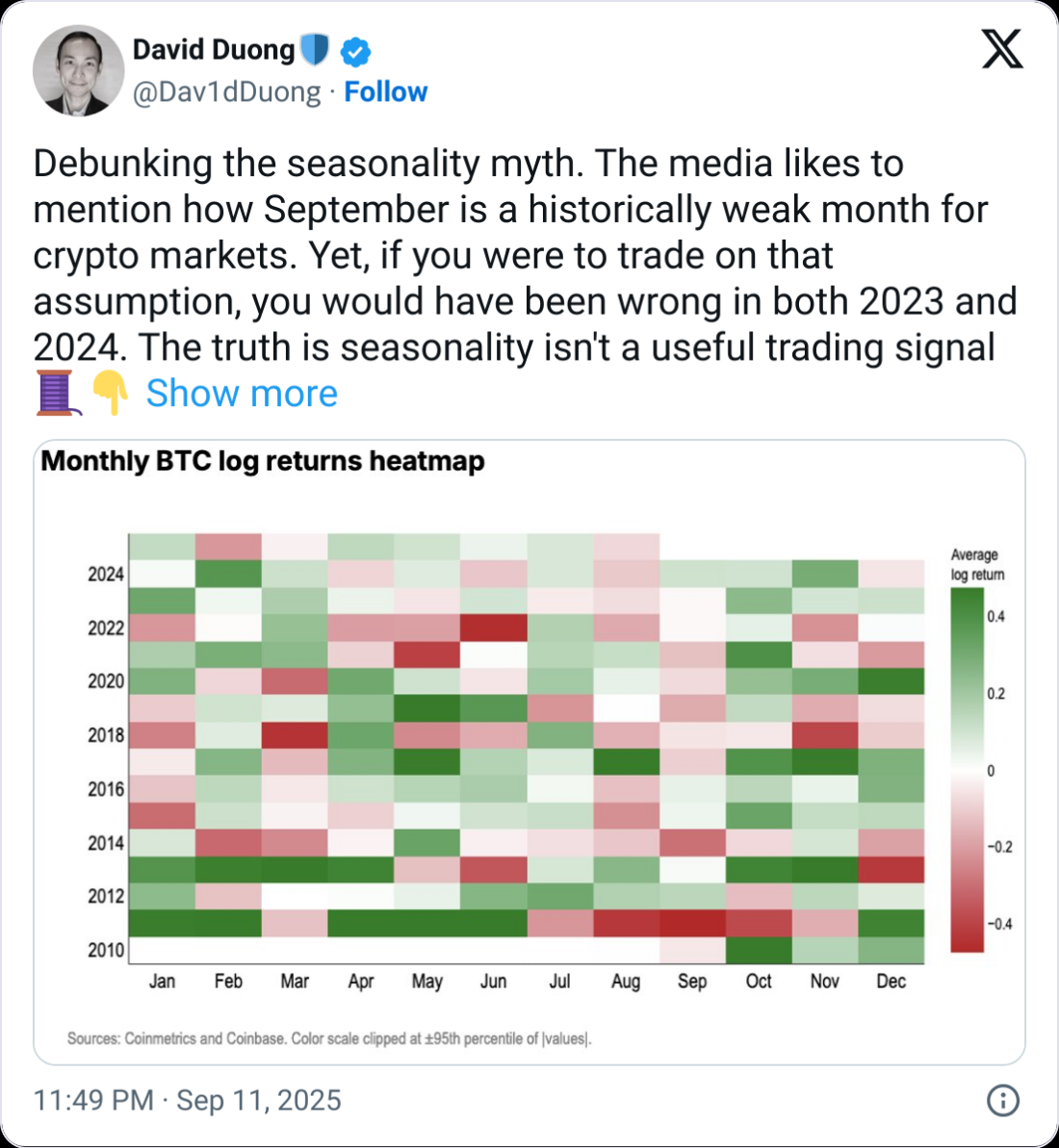 Meanwhile, Coinbase’s researchers said the “September effect,” where investors hold off on Bitcoin due to it historically falling over the month, shouldn’t be relied on as a trading indicator.
