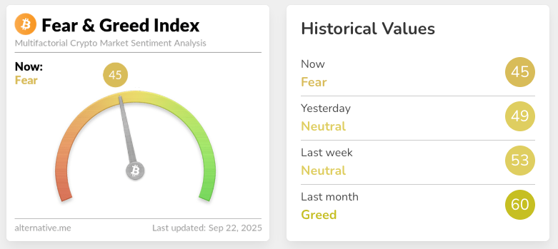 According to data from Alternative.me, the Crypto Fear & Greed Index was neutral last week with a score of 53. The index dropped to “Fear” on Monday, with a score of 45.