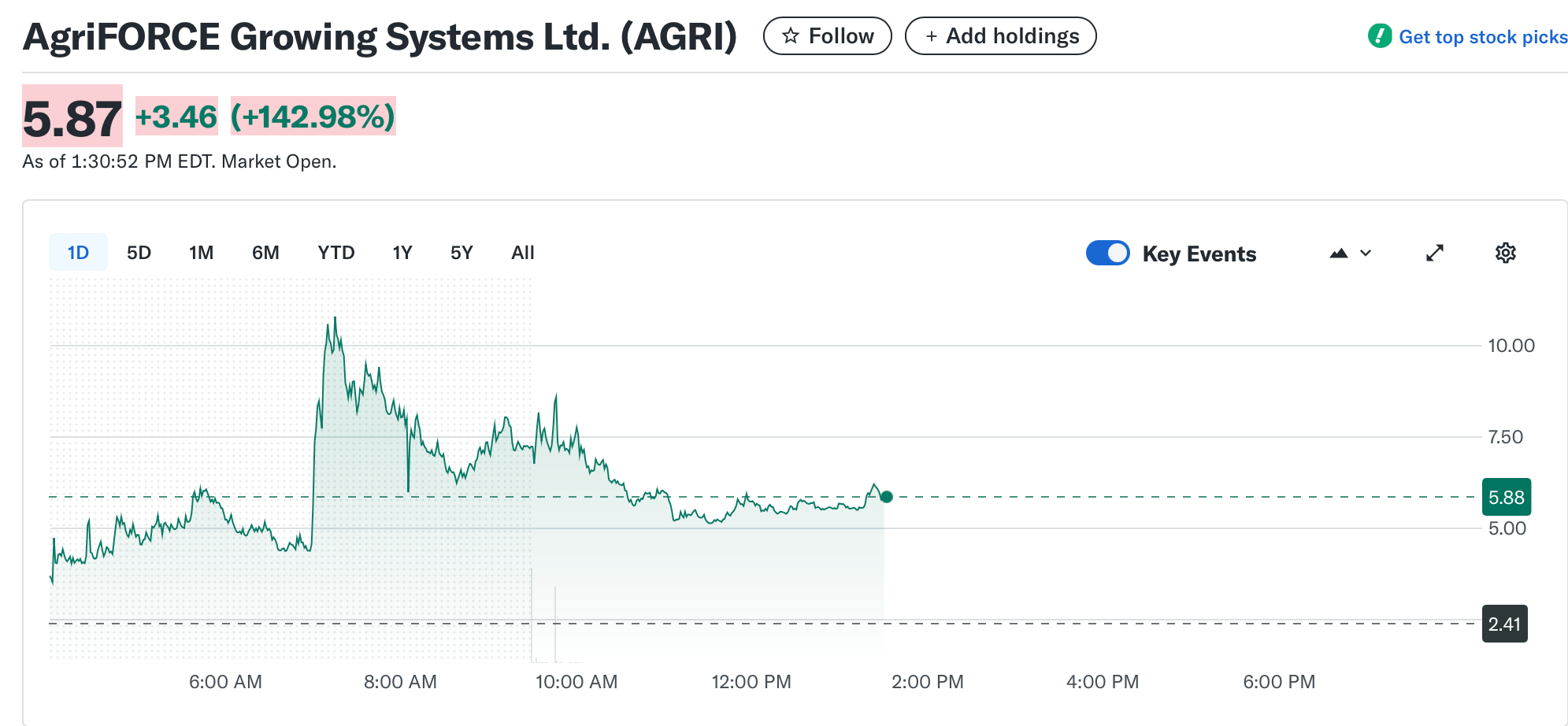 AGRI stock surged from a $2.41 close on Friday to open at $7.30 on Monday, according to data from Yahoo Finance, retracing to finish the trading day on Nasdaq at $5.73, rising by 137%.