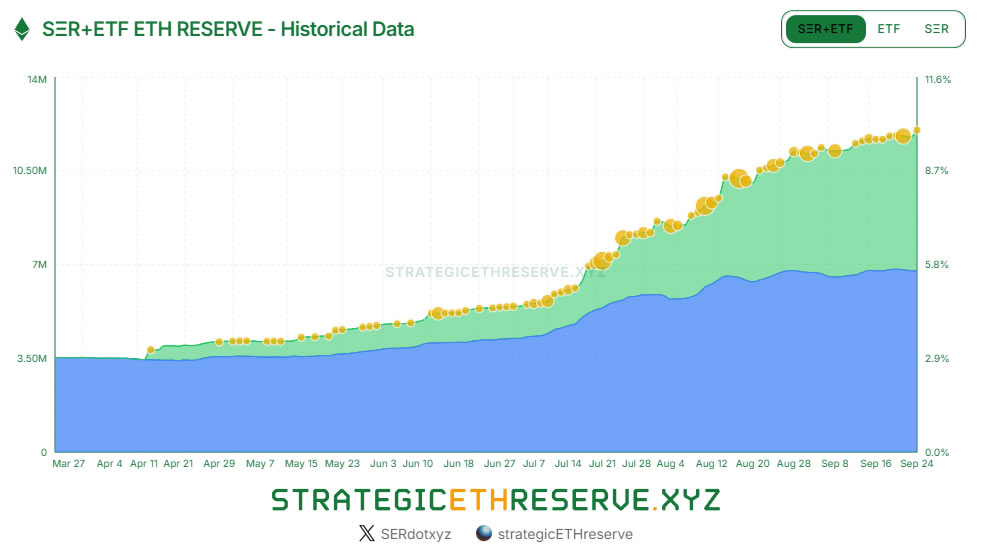 Since April, around 68 entities have scooped up 5.26 million ETH worth around $21.7 billion and representing 4.3% of the entire supply, according to StrategicEthReserve.