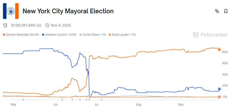 Mamdani is way ahead on Polymarket prediction polls. Source: Polymarket