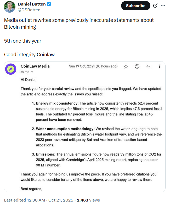 Some of Batten’s recent push back against crypto enviromental FUD. Source: Daniel Batten