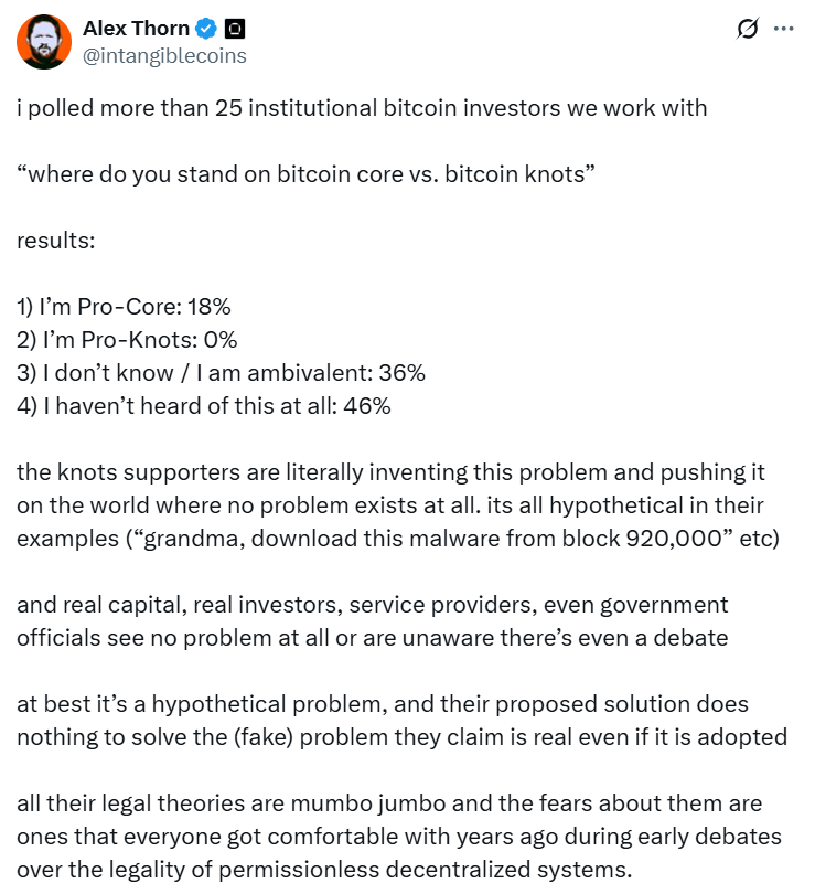 The majority of institutional Bitcoin investors don’t seem to know or care about the Bitcoin Core vs Knots debate that has been raging on for the past few months, according to Galaxy Digital’s head of research, Alex Thorn.