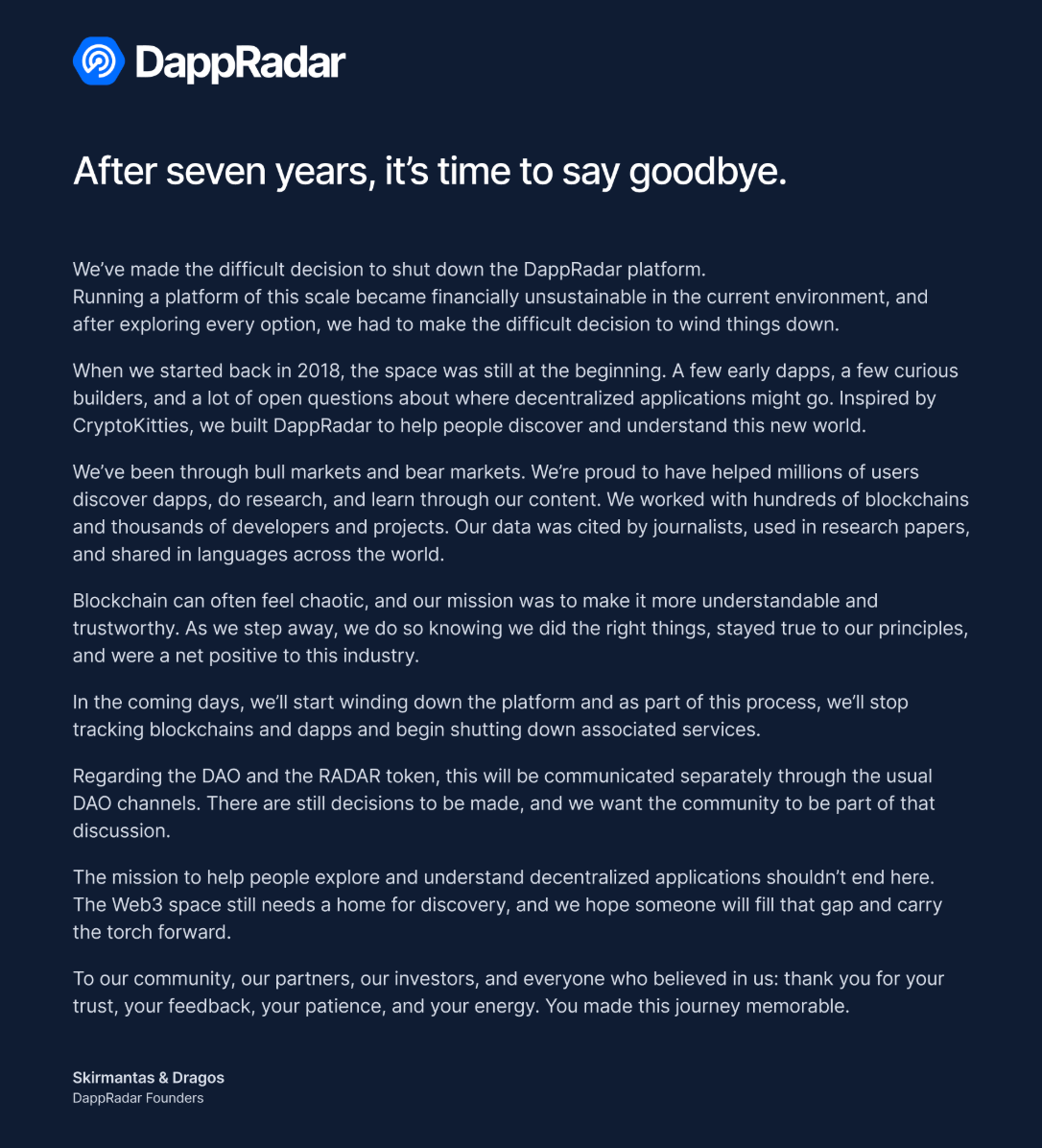 In a Monday X post, DappRadar founders Skirmantas Januškas and Dragos Dunica said they would be winding down the platform. The pair said that “running a platform of this scale became financially unsustainable in the current environment,” and said it plans to stop tracking blockchains and DApps “in the coming days” as it begins to shut down.
