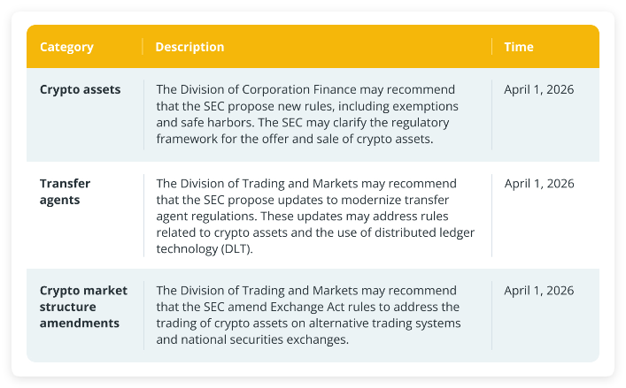 The following table provides a brief overview of the SEC’s revised 2025 plan: