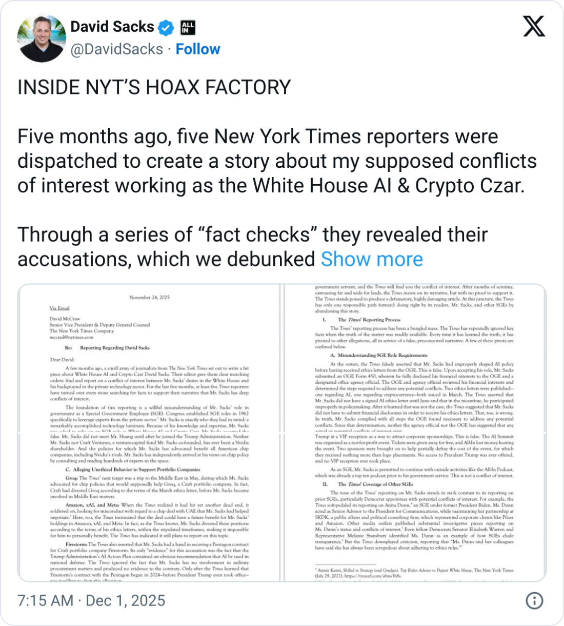 White House AI and crypto czar David Sacks has fired back at The New York Times over a report detailing how his government advisory role could benefit his investments and his close associates.