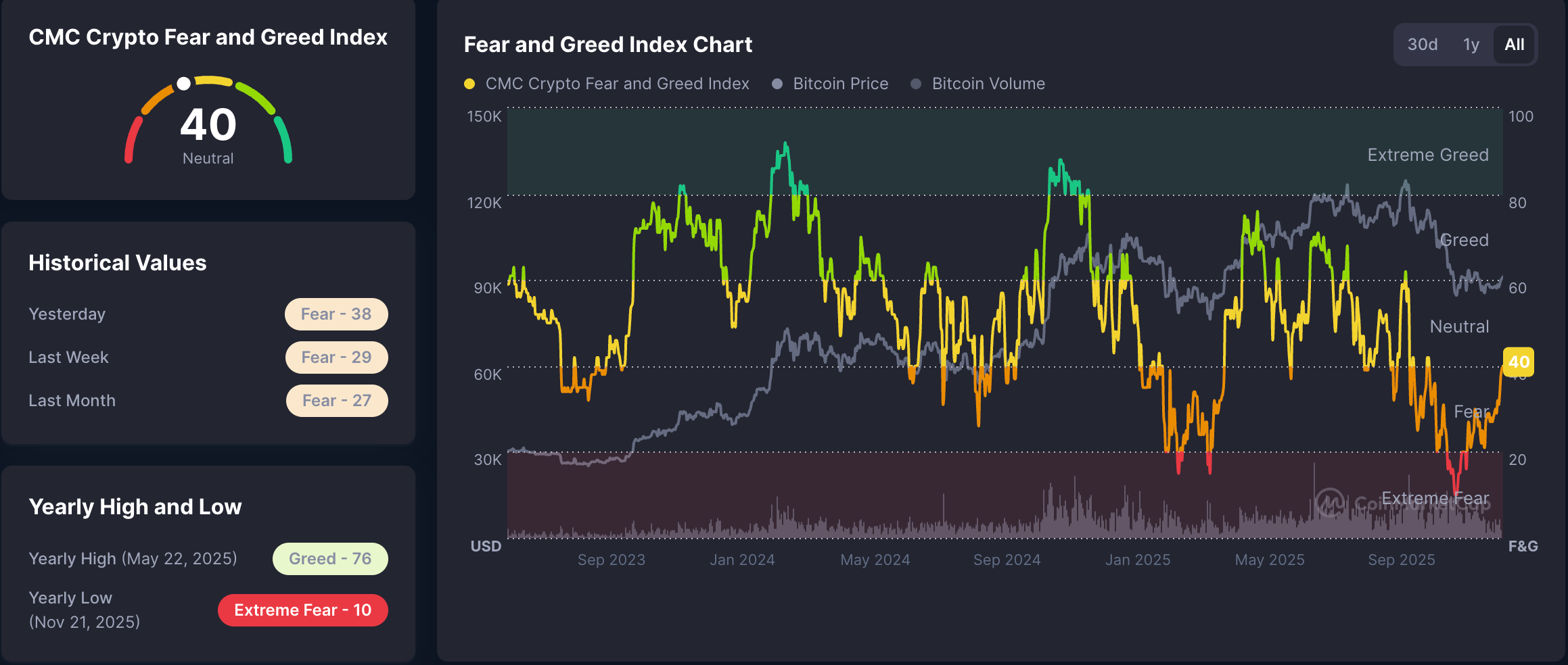 The Index is at 40, signaling that investors are no longer fearful, but they are not bullish on the crypto market either. The Index recorded its lowest sentiment reading of 2025 in November, when it hit a 10, indicating “extreme fear,” according to CoinMarketCap.