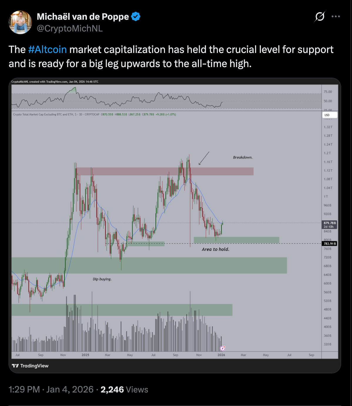 The altcoin market, which is valued at over $879 billion at the time of this writing, is poised for its next major leg up toward its previous all-time high of nearly $1.2 trillion, according to crypto trader and market analyst Michaël van de Poppe.