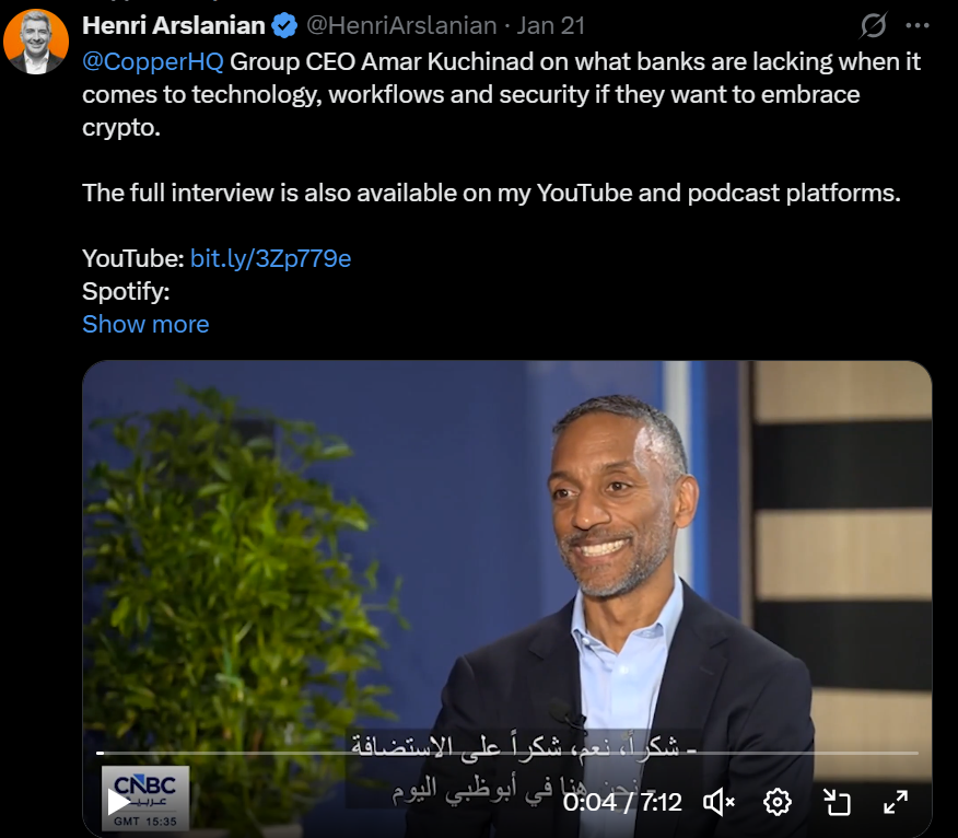 Backed by Barclays, Copper provides institutional-grade custody, settlement and collateral management services designed to help financial institutions store and move digital assets while reducing counterparty risk.