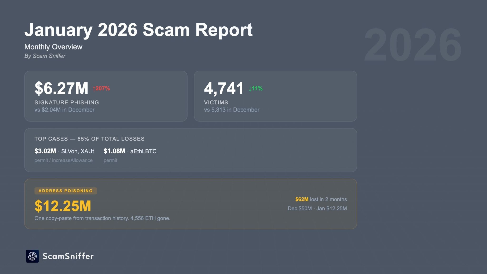 Address poisoning and signature phishing attacks have increased in January: Source: Scam Sniffer