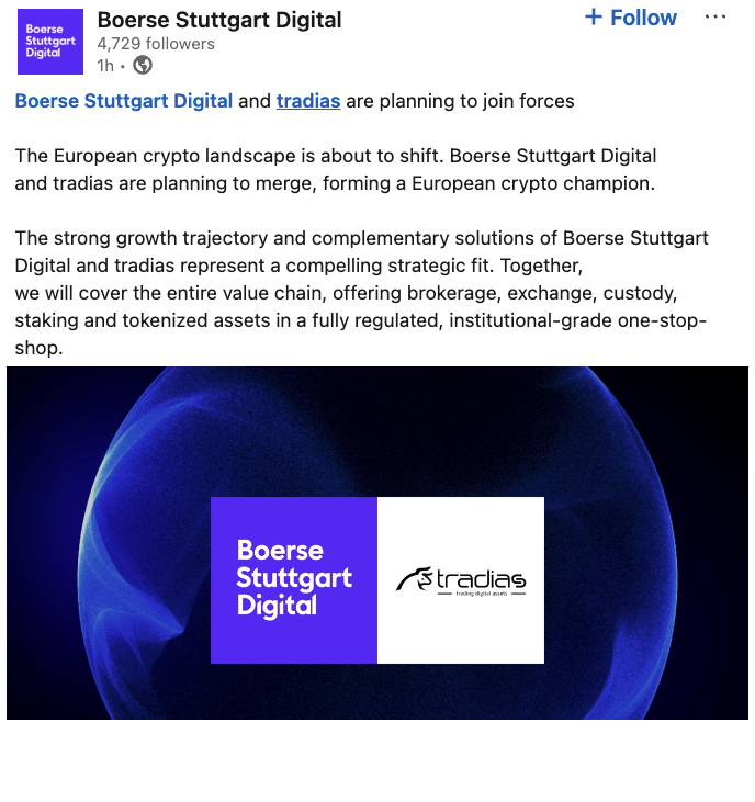 Boerse Stuttgart will merge its crypto arm with Tradias, creating a regulated European crypto unit providing services in trading, custody, staking and tokenized assets.