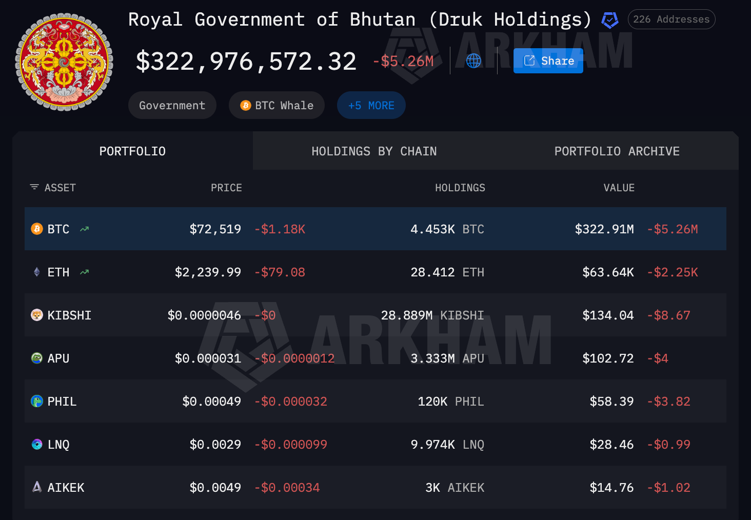 Bhutan’s crypto portfolio. Source: Arkham Intelligence